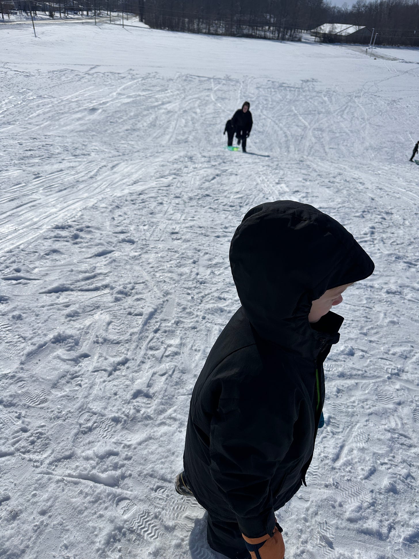 We go sledding on a Sunday morning with the boys. They’ve been asking for a sled for several winters now, but we never lived near a good place to sled, quite aside from which, any time it genuinely occurred to us to get one, our timing was off and they were all sold out, and would only come back in stock weeks later, when the snow had started to thaw.